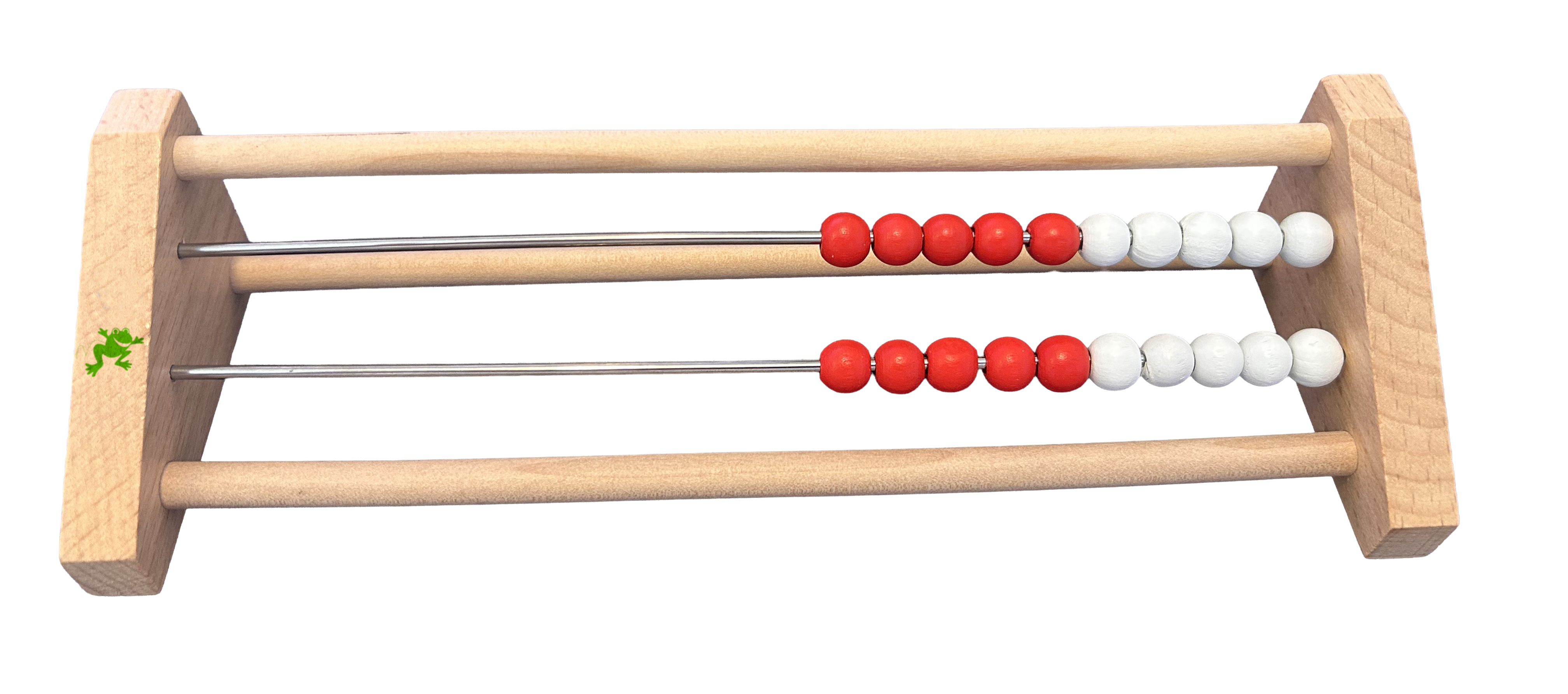 Een houten rek met twee stalen staven en twintig houten kralen. Deze twintig kralen zijn eerlijk verdeeld over beide staven. Op de bovenste staaf zitten vijf rode en vijf witte kralen. Op de onderste staaf ook. Zet het rek zo voor u neer dat u links Kikker ziet en schuif de kralen naar rechts. Het kralenrek staat nu in rust en klaar om, gebruikmakend van de 5-, 10- en dubbelstructuur op het rek, getalbeelden tot en met 20 in te oefenen. Kennen van de getalbeelden tot en met 20 plaveit de weg naar het verkort en flexibel kunnen oplossen van opgaven in dit getallengebied. In de bijgeleverde handleiding leest u aan de hand van een voorbeeldles hoe het inoefenen zoals bedoeld eruit ziet.