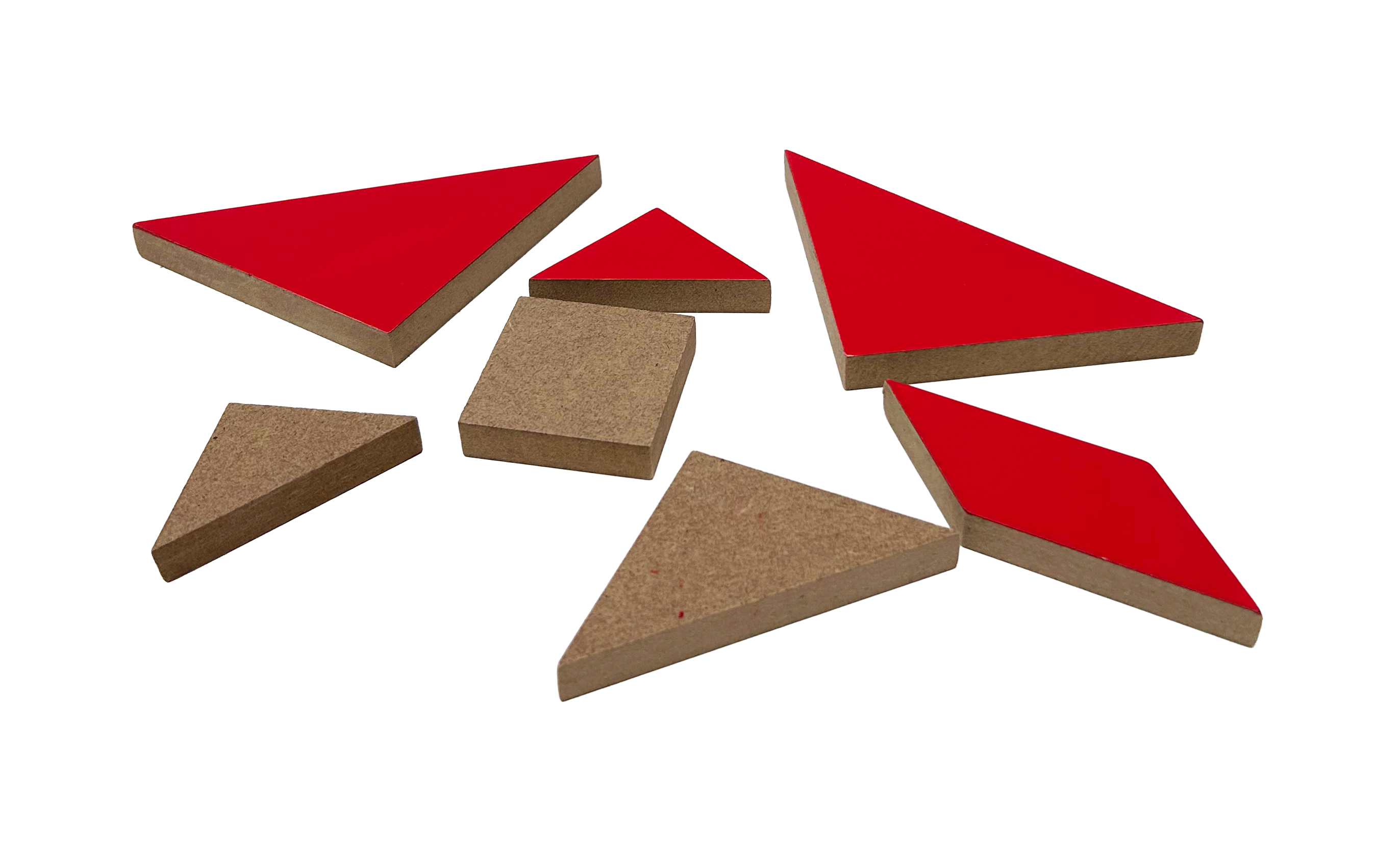 Het grote formaat maakt dat het geschikt is voor klassikaal gebruik, maar komt ook tegemoet aan leerlingen die beter af zijn als zij mogen werken met grote(re) tangramstukken. De vervaardiging van hout komt de zintuigelijke beleving ten goede. De keuze voor de ene zijde rood en de andere zijde hout is behalve een esthetische ook een vakdidactische. In de bijgeleverde handleiding leest u hoe leerlingen met deze kleurkeuze zich begrippen als parallellogram, lijn- en puntsymmetrie eigen maken.