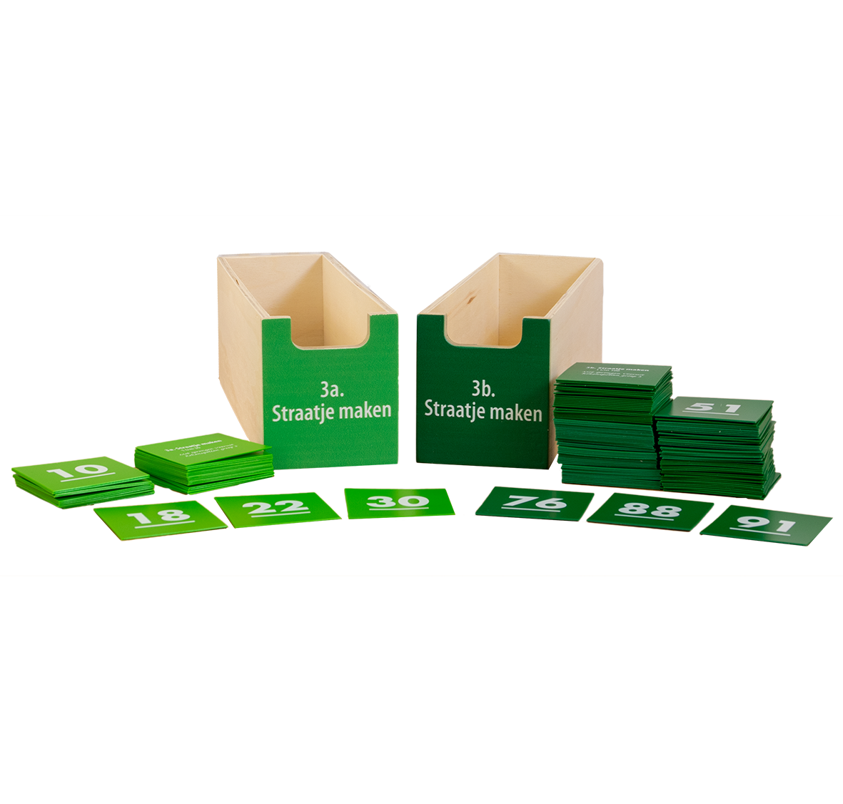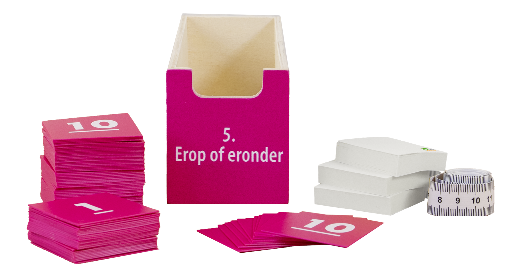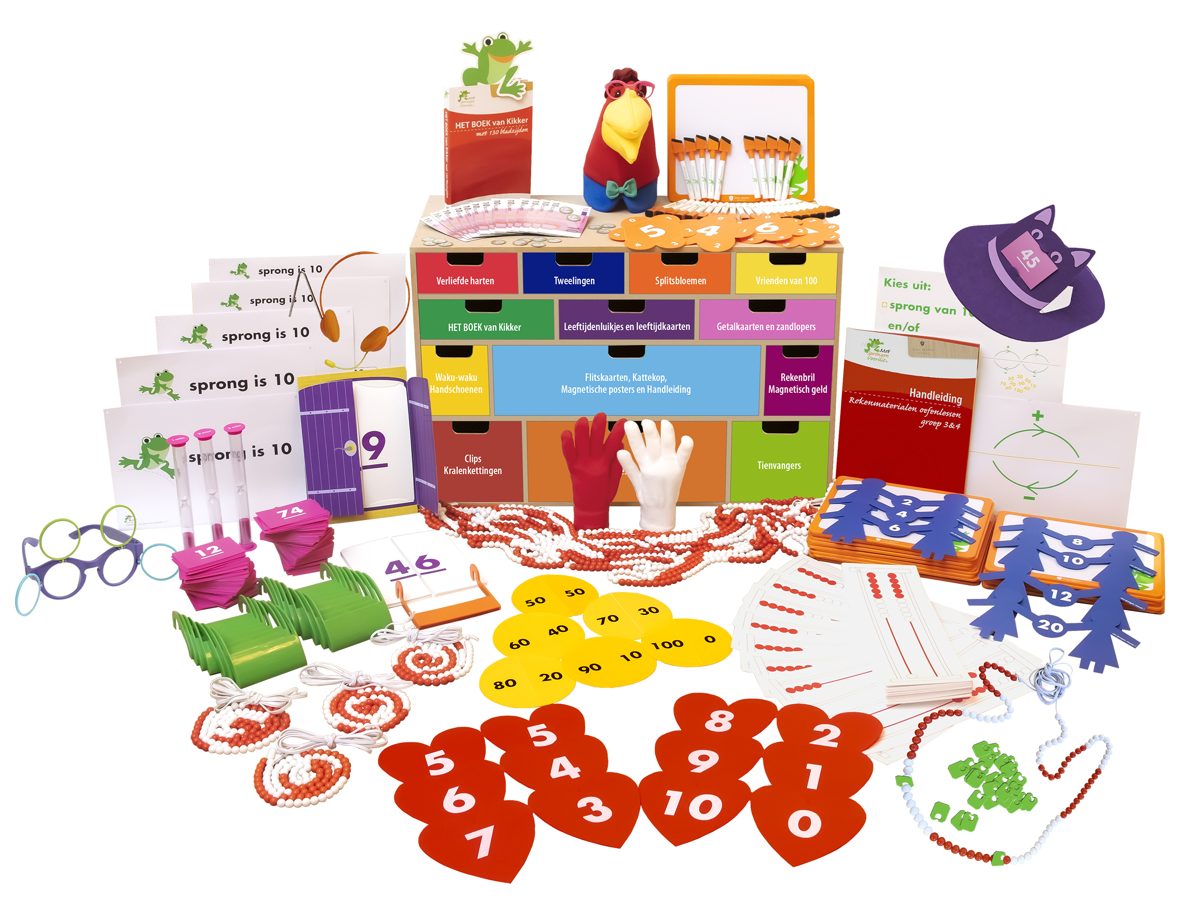 In deze ladekast vindt u rekenmaterialen met een uitgebreide handleiding voor het geven van oefenlessen op de onderdelen: Leren tellen, Ordenen & lokaliseren, Opbouw van getallen. Aanvullen tot 10, Splitsingen, Sprong van 10, Eigen producties (laten maken), Opereren op de lege getallenlijn, Bijna-verdwijnsommen en Formeel rekenen. De materialen zijn bedoeld om in te zetten bij het geven van interactieve klassikale reken-wiskundelessen in groep 3&4, maar kunnen ook dienst doen bij het geven van verlengde instructie, pre- en remedial teaching. De materialen in deze kast maken deel uit van de leerlijn optellen en aftrekken t/m 130. Hoe u er precies mee werkt, komt aan de orde in de cursus Met Sprongen Vooruit groep 3&4 Basis.