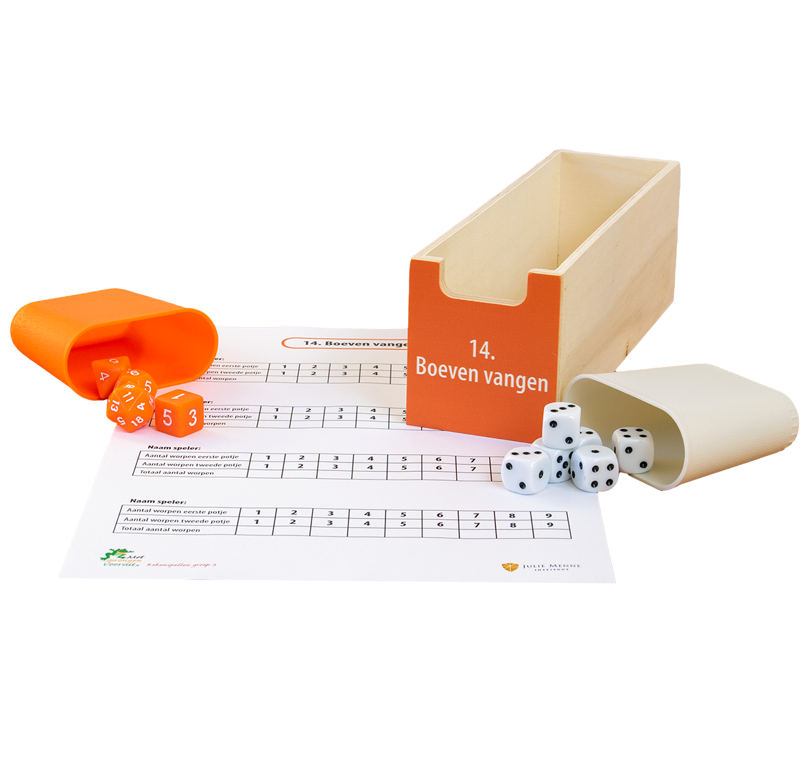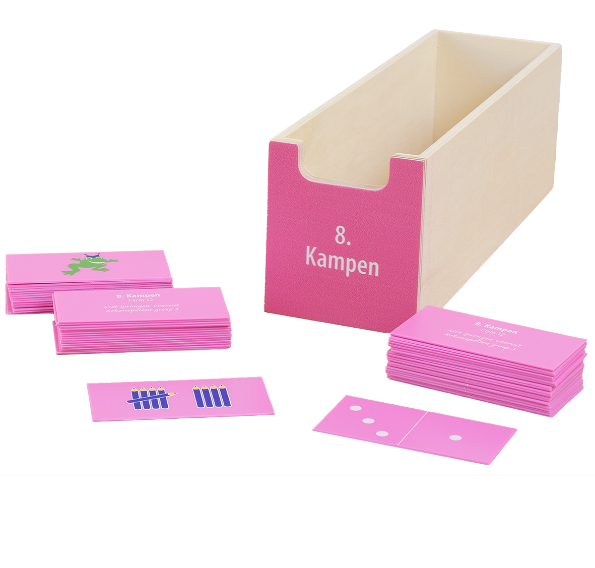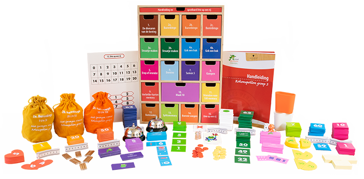 In deze ladekast vindt u instructiematerialen, gezelschapsspellen, prentenboeken én de Buitenkoffer voor het verzorgen van oefenlessen op de onderdelen: Leren tellen, Ordenen & lokaliseren, Aanvullen tot 10, Opbouw van getallen, Splitsingen, Sprong van 10, Opereren op de lege getallenlijn, Bijna-verdwijnsommen, Formeel rekenen en Vermenigvuldigen & delen. U krijgt toegang tot de instructiefilms waarin de gezelschapsspellen in 2 minuten worden uitgelegd. Deze ladekast, voorzien van een handleiding, zet u in bij het verzorgen van interactieve reken-wiskundelessen in groep 3&4, het geven van verlengde instructie, pre- en remedial teaching. De spellen zijn in te zetten tijdens een spellencircuit.