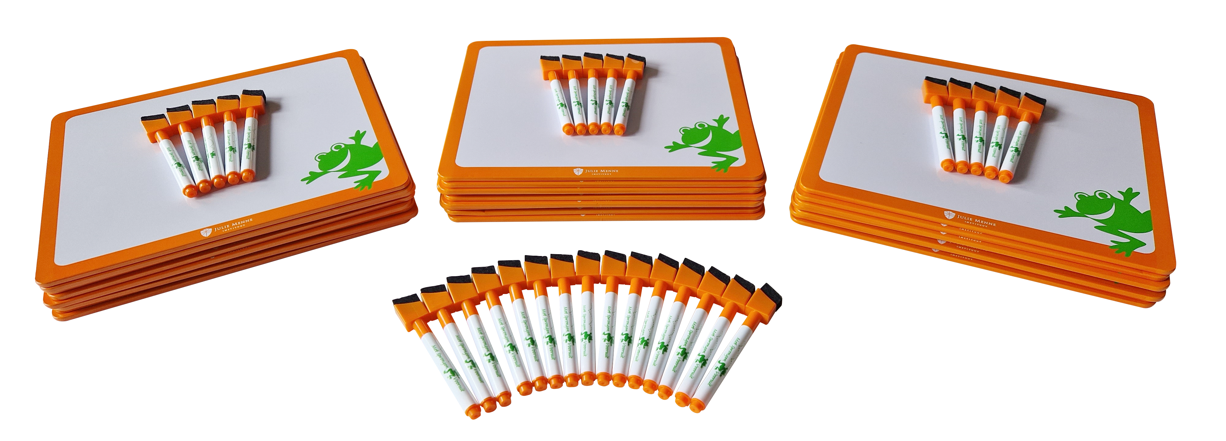 • Beschrijfbare driedimensionale driehoekige kaarten (30 stuks),wisbordstift en zandloper