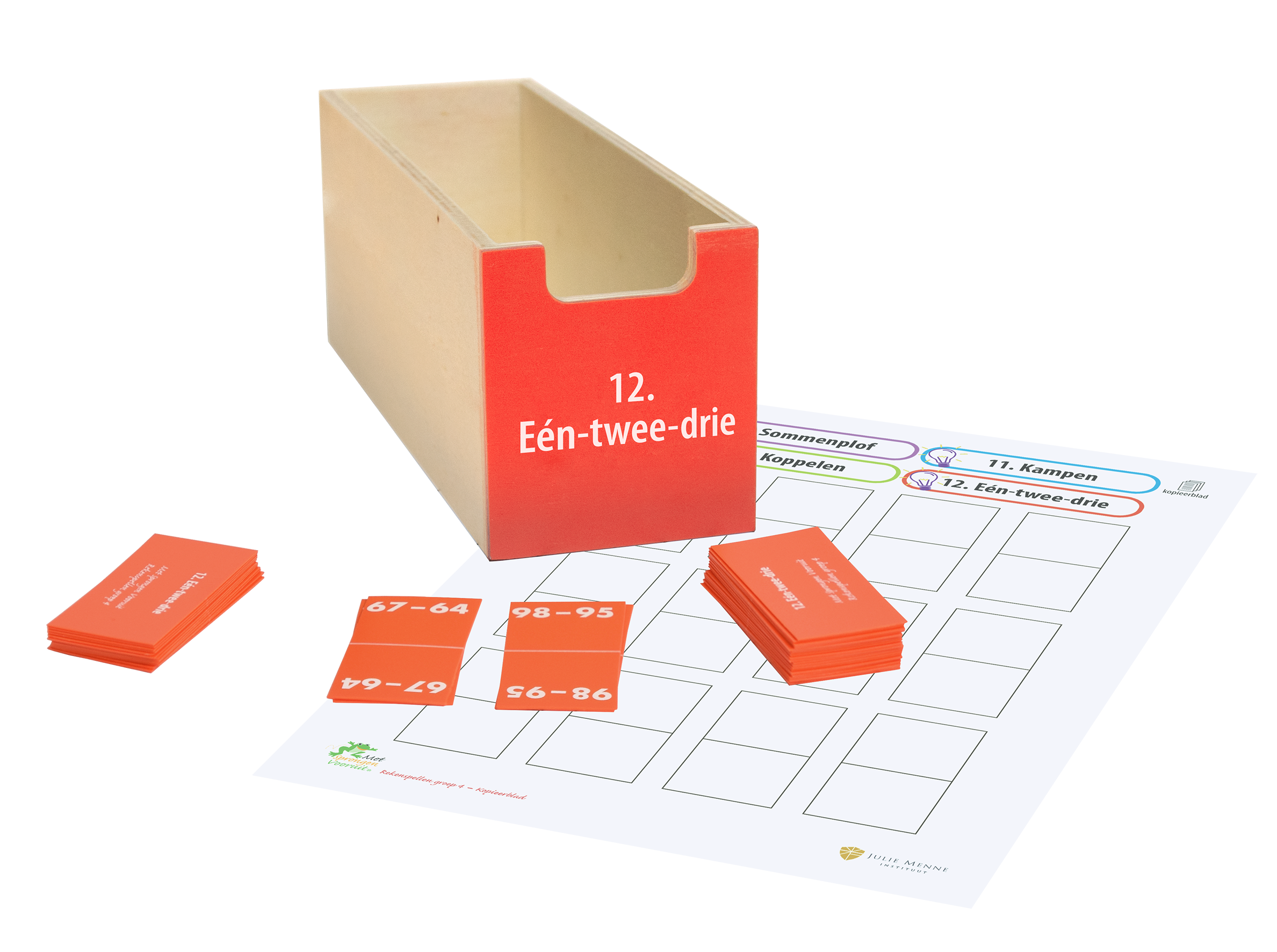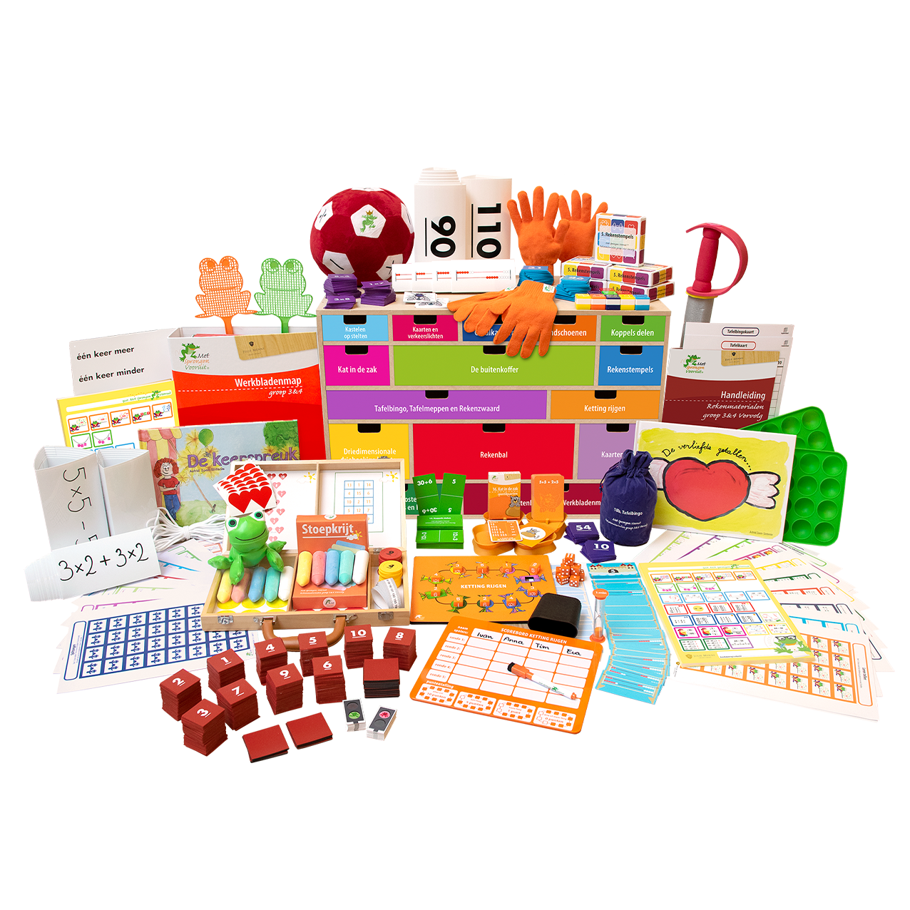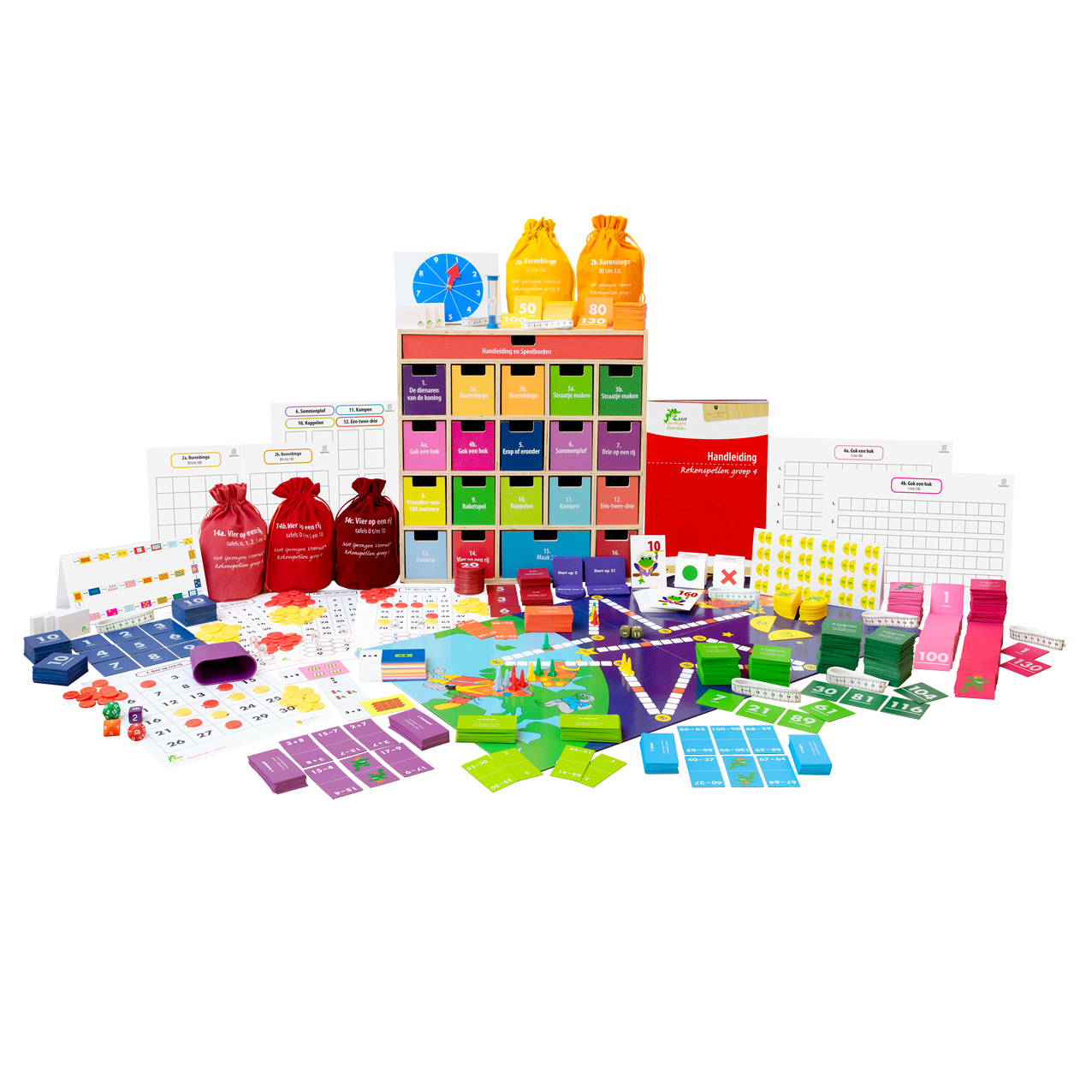 In deze ladekast vindt u instructiematerialen, gezelschapsspellen, prentenboeken én de Buitenkoffer voor het verzorgen van oefenlessen op de onderdelen: Leren tellen, Ordenen & lokaliseren, Aanvullen tot 10, Opbouw van getallen, Splitsingen, Sprong van 10, Opereren op de lege getallenlijn, Bijna-verdwijnsommen, Formeel rekenen en Vermenigvuldigen & delen. U krijgt toegang tot de instructiefilms waarin de gezelschapsspellen in 2 minuten worden uitgelegd. Deze ladekast, voorzien van een handleiding, zet u in bij het verzorgen van interactieve reken-wiskundelessen in groep 3&4, het geven van verlengde instructie, pre- en remedial teaching. De spellen zijn in te zetten tijdens een spellencircuit.
