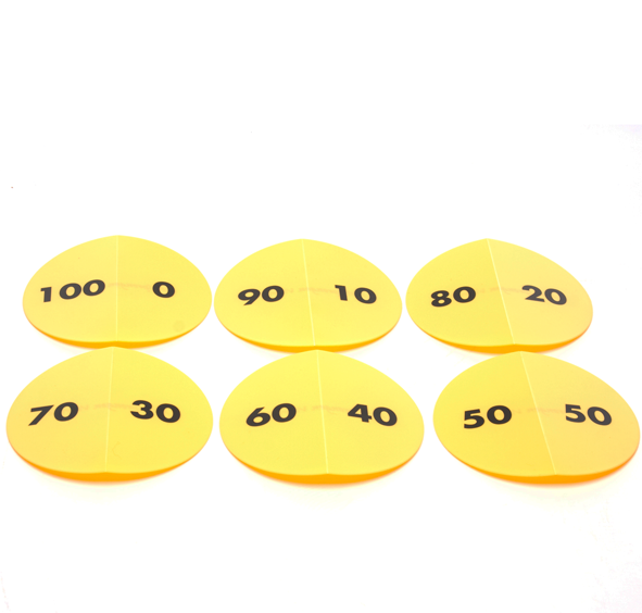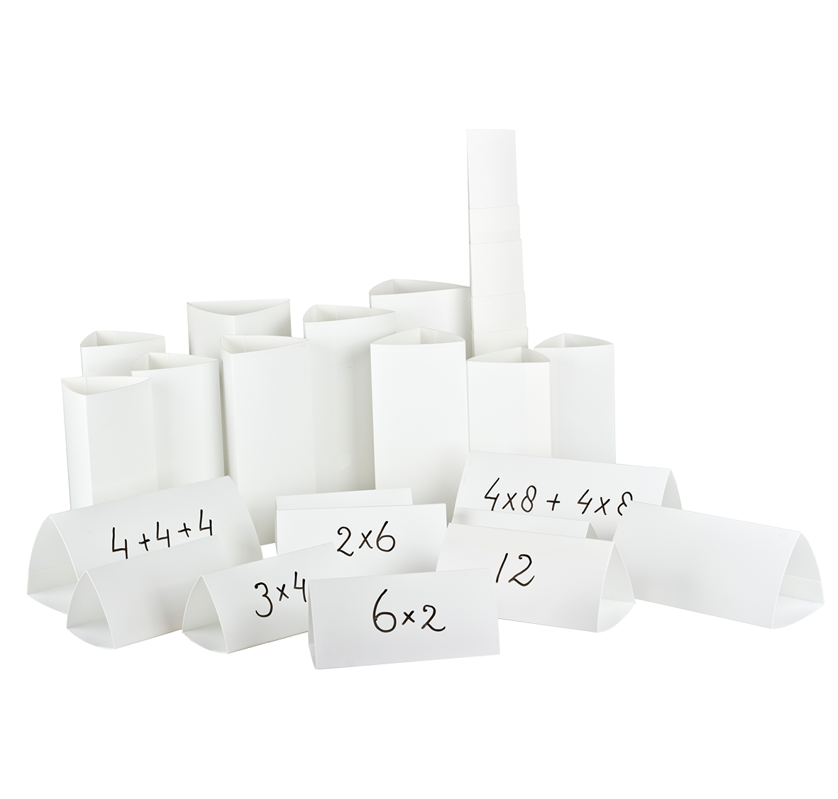 • Beschrijfbare driedimensionale driehoekige kaarten (30 stuks),wisbordstift en zandloper