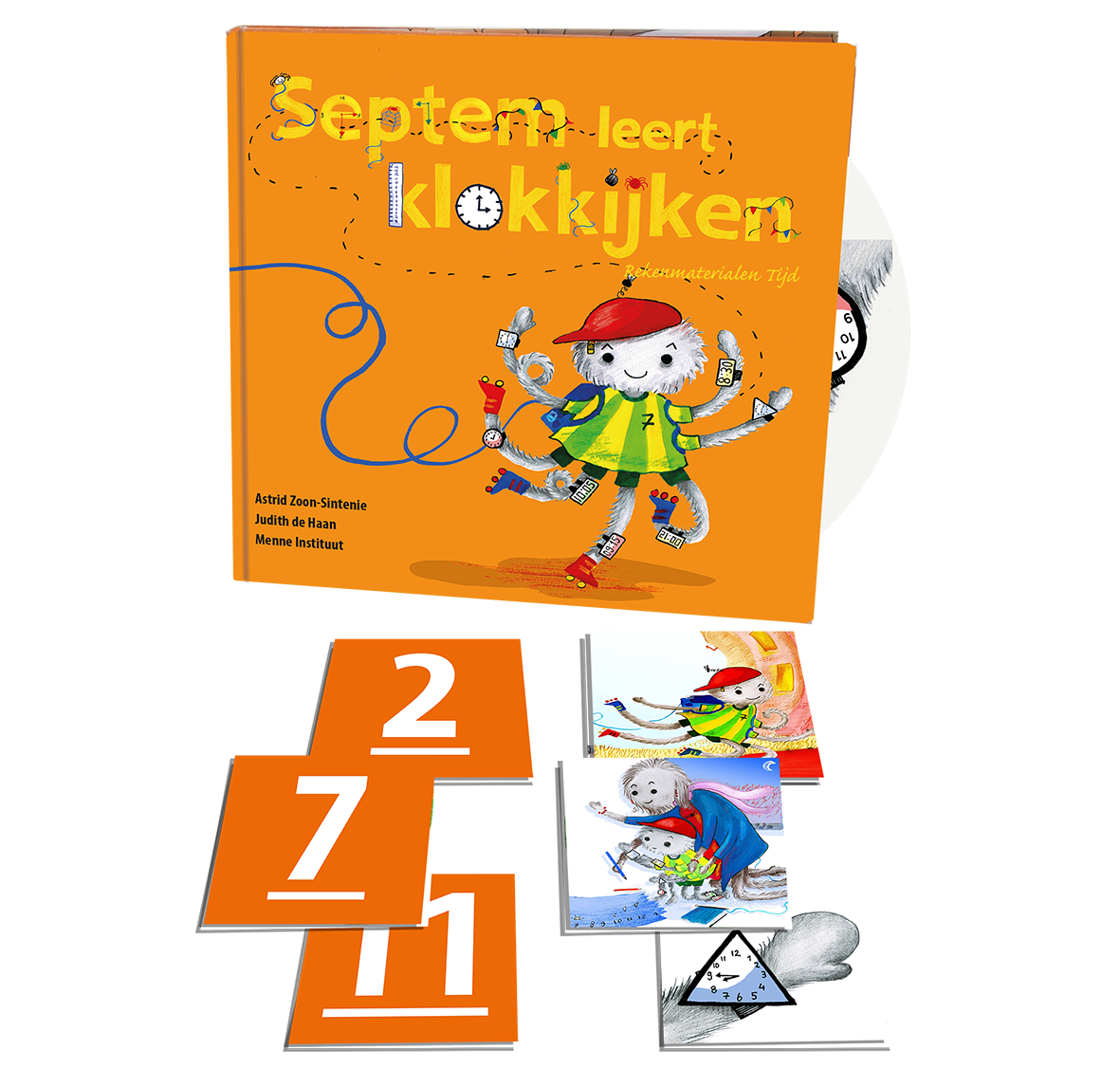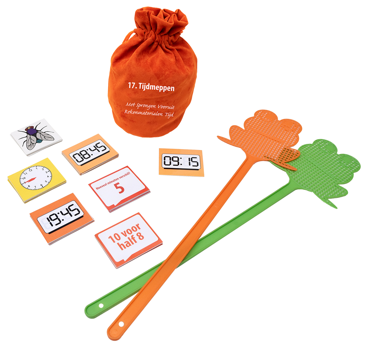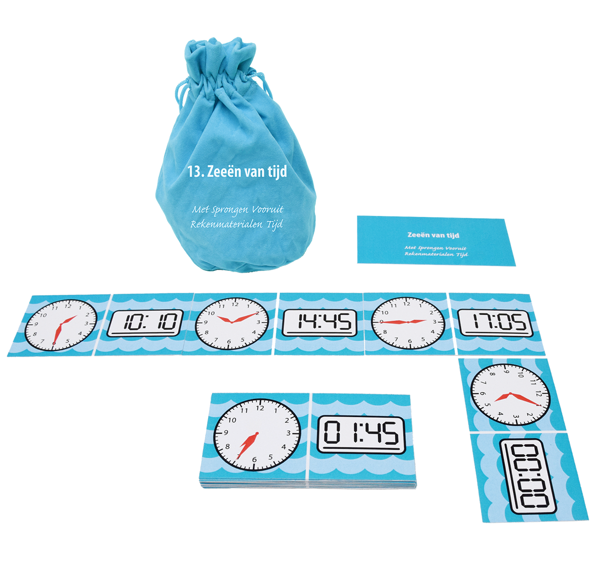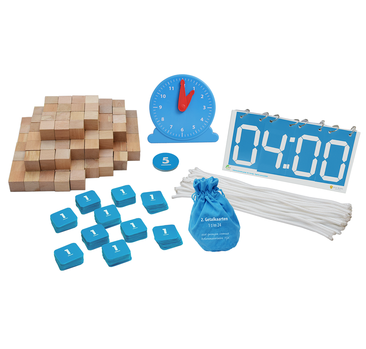 • Instructieklokken (wijzerplaat en viercijferige), kubusblokjes, getalkaarten, touwtjes en minutenkaarten