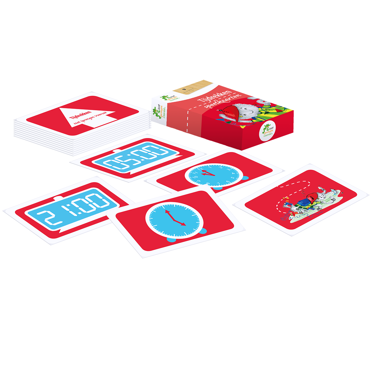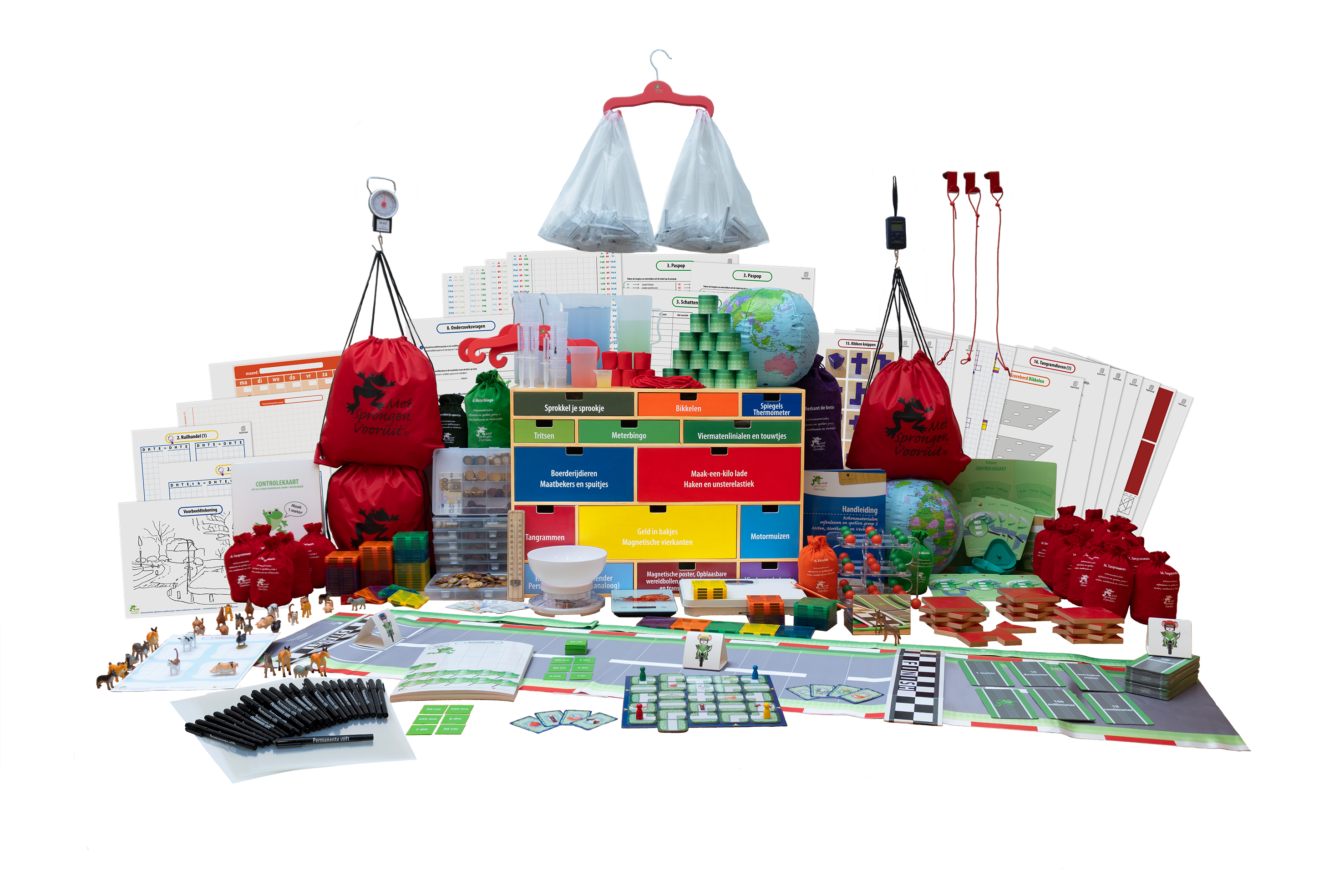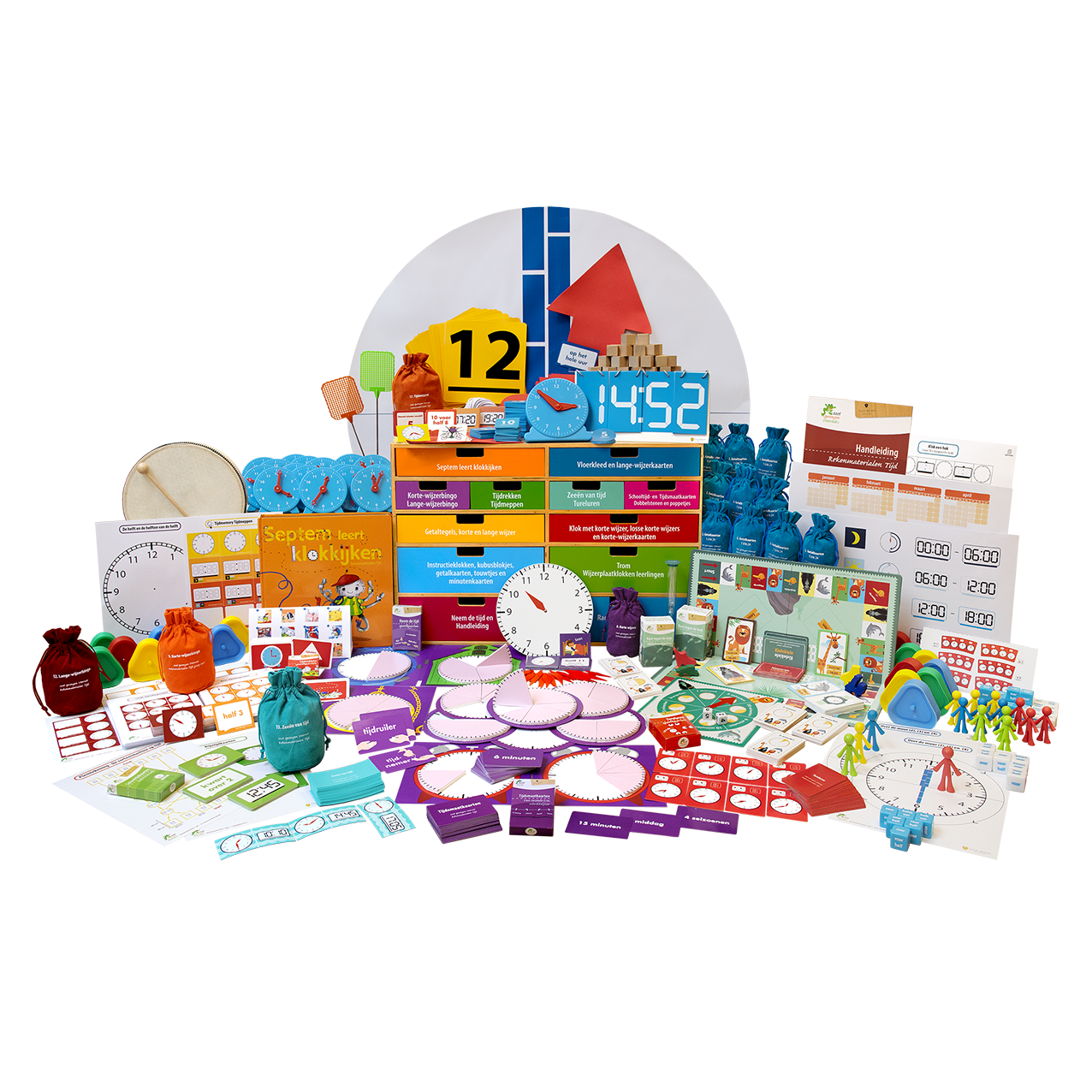 In deze ladekast vindt u materialen en spellen om leerlingen te leren klokkijken, zowel op een wijzerplaat- als viercijferige positieklok. In de bijbehorende handleiding treft u bij elk materiaal een of meer voorbeeldlessen (ook voor buiten!) aan voorzien van de rekendoelen, suggesties voor vereenvoudiging, verdieping en variatie aan. Bij de spellen staan, behalve de spelregels, ook de didactische aanwijzingen voor het behalen van de doelen beschreven. In de instructiefilmpjes, die u bij deze kast krijgt, wordt elk spel in 2 minuten uitgelegd. Verder is er per les en per spel aangegeven waar deze zich in de leerlijn bevinden. De inhoud van deze kast komt aan de orde in de cursus Met Sprongen Vooruit groep 5&6 Vervolg. In het cursusmateriaal, dat u bij deze cursus krijgt, wordt materiaal in de vorm van kopieerbladen verstrekt waarmee u een complete leerlijn Leren klokkijken in handen heeft.