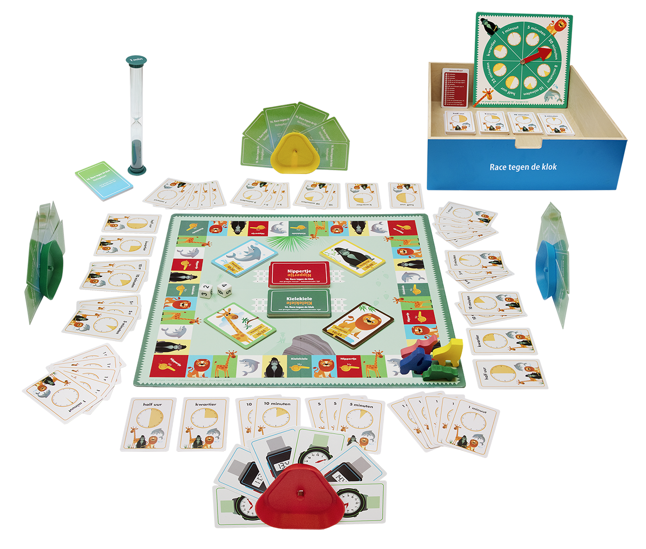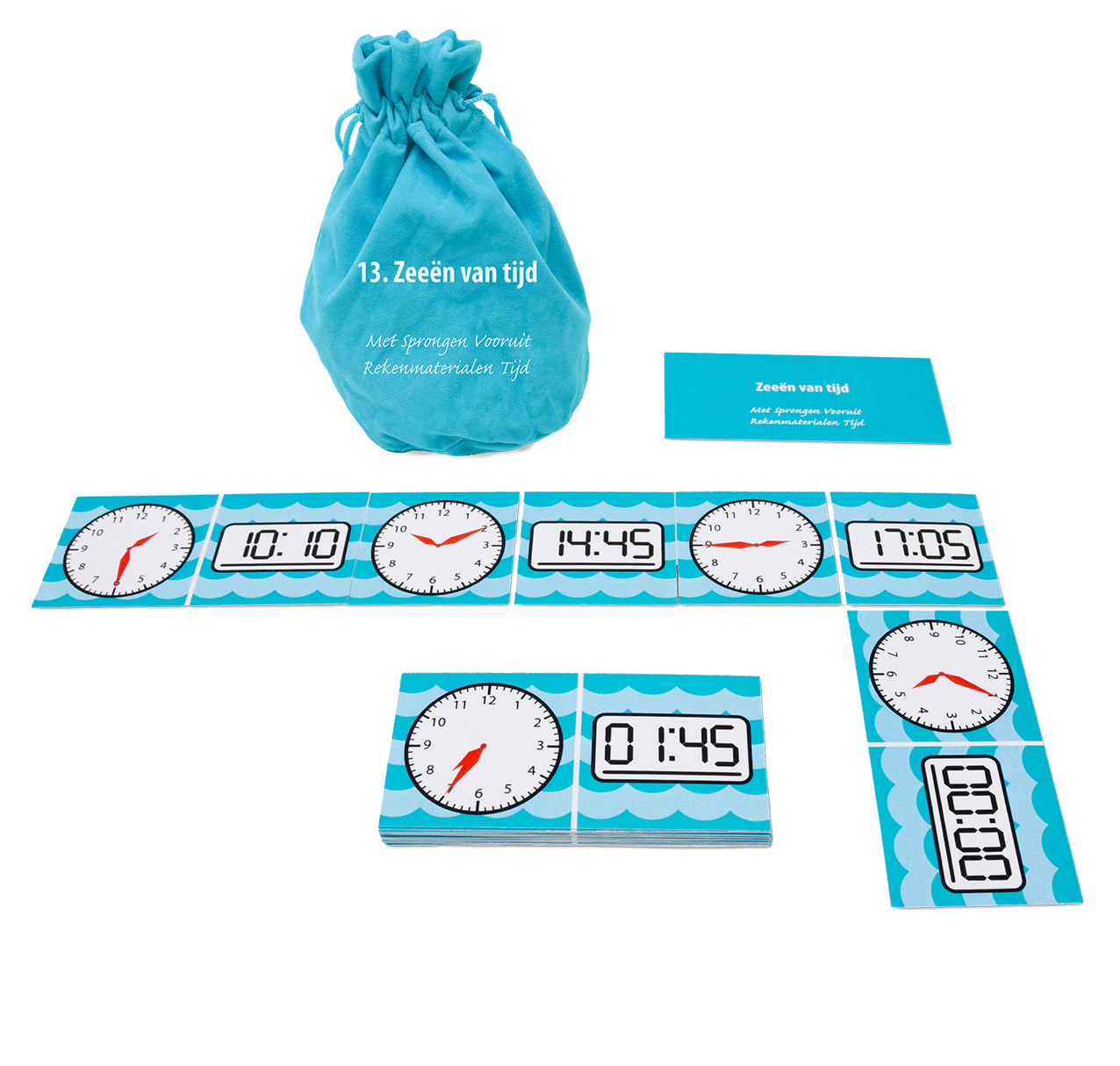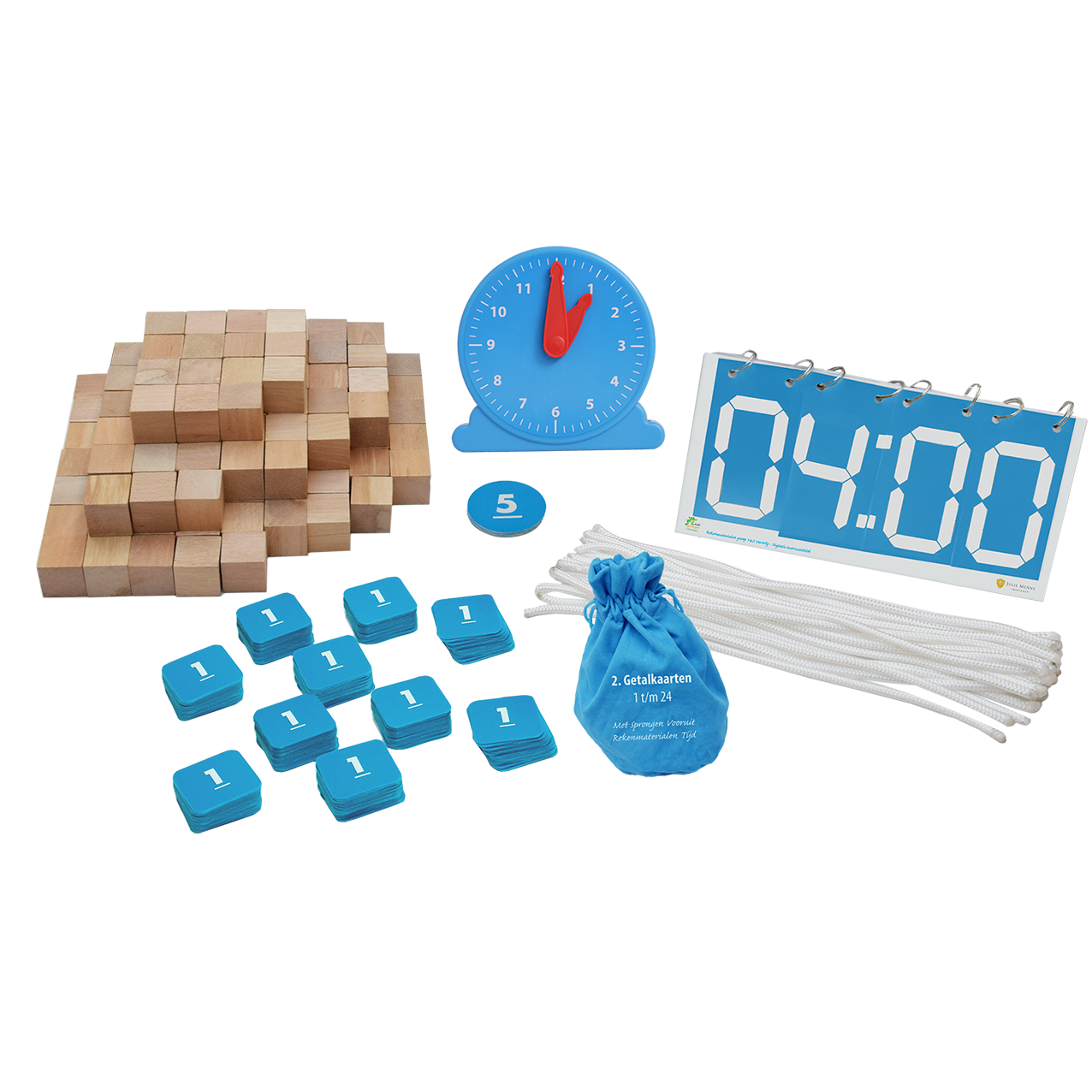 (wijzerplaat en viercijferige), kubusblokjes, getalkaarten, touwtjes en minutenkaarten