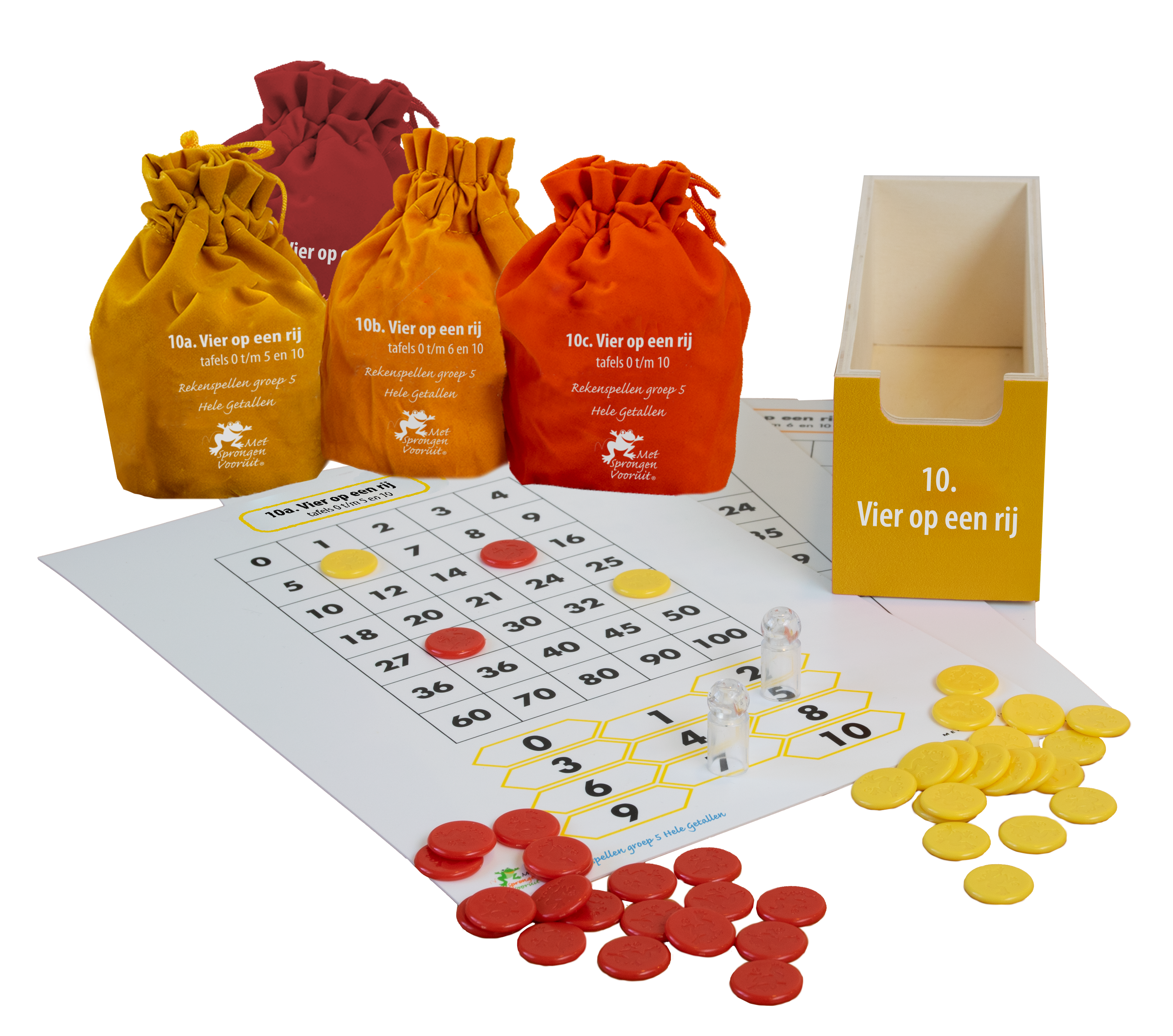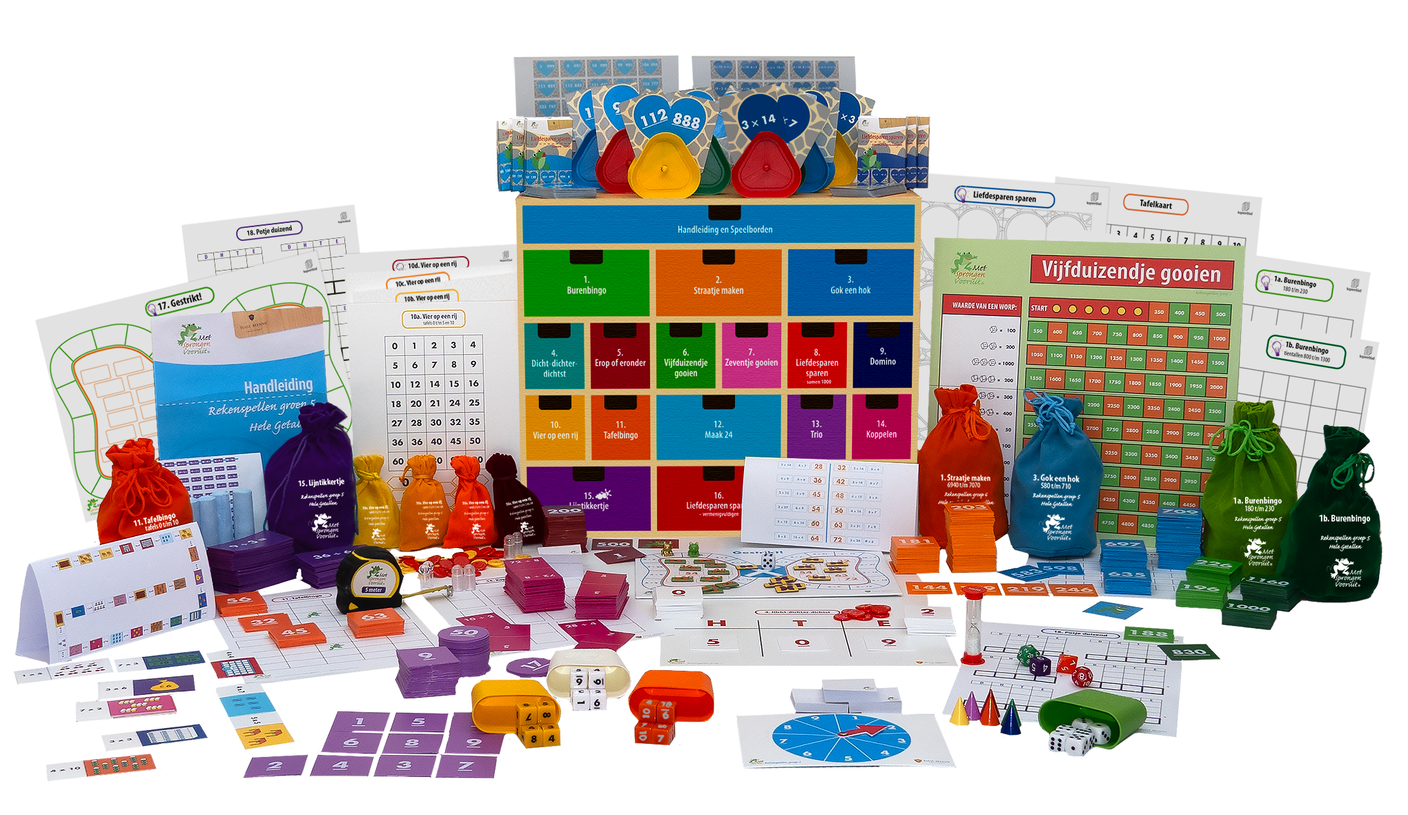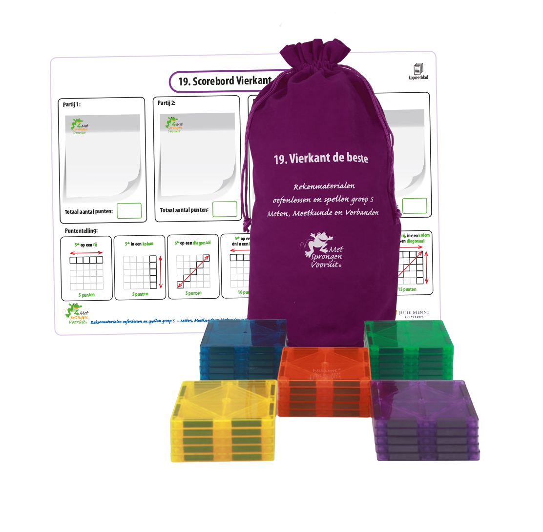In deze ladekast vindt u zesentwintig educatieve rekenspellen, waaronder ook eentje ook voor buiten. De gezelschapsspellen maken deel uit van de leerlijn Hele Getallen – bewerkingen t/m 13.000 en hebben als overkoepelend doel opgaven in dit getallengebied te automatiseren. De spelregels en didactische aanwijzingen voor het behalen van de doelen staan beschreven in de handleiding. Hierin is per spel ook aangegeven waar het in de leerlijn past. Daarnaast krijgt u toegang tot de instructiefilms waarin elk spel in 2 minuten wordt uitgelegd. De spellen zijn goed in te zetten tijdens de verlengde instructie, pre-teaching, remedial teaching en een spellencircuit. In de cursus Met Sprongen Vooruit groep 5&6 Basis komen de spellen ook aan de orde.