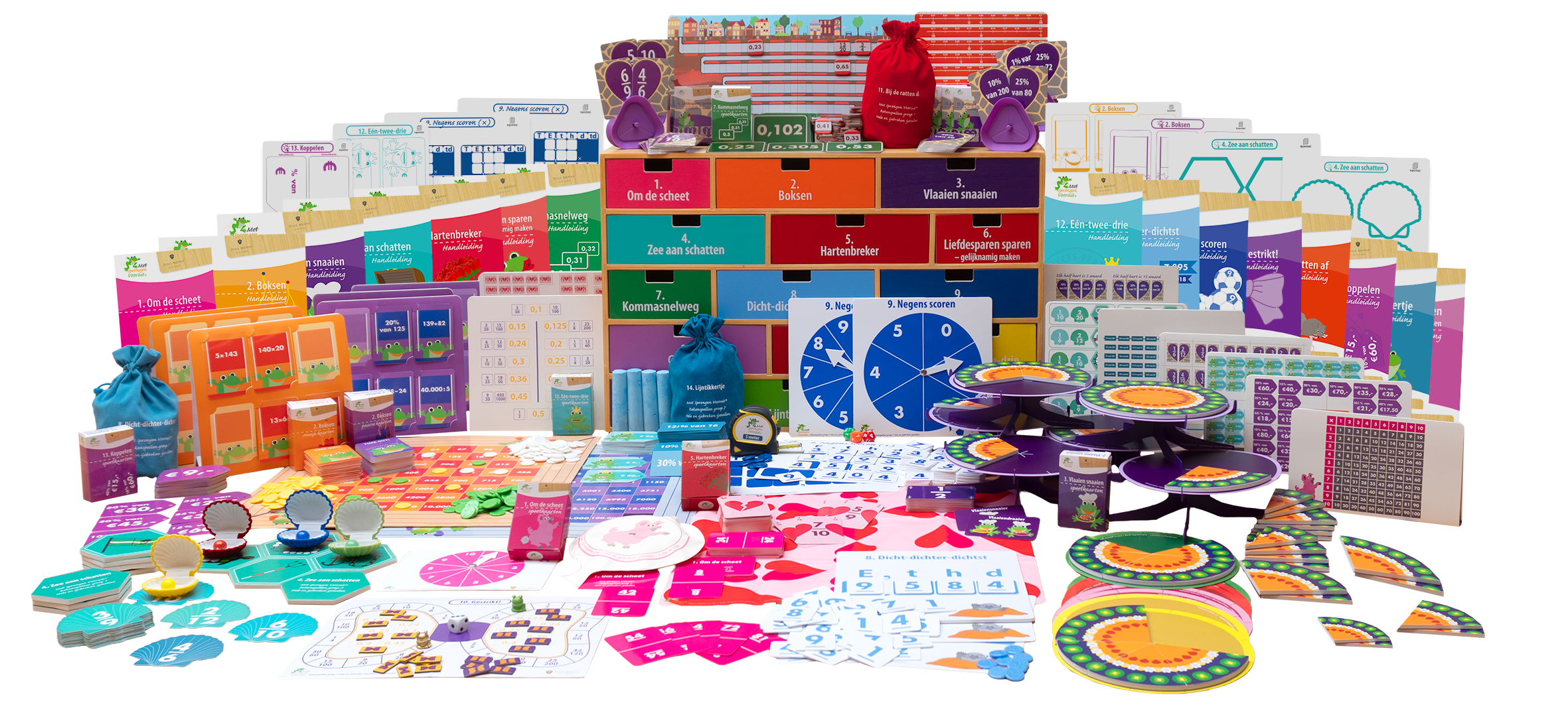 Deze ladekasten ondersteunen u bij het lesgeven met het doelendekkende reken-wiskundeprogramma Met Sprongen Vooruit met betrekking Hele en Gebroken Getallen in groep 7 en zijn in te zetten bij interactieve, klassikale oefenlessen, verlengde instructie, pre- en remedial teaching. De ladekast met rekenspellen kunt u tevens inzetten tijdens een spellencircuit.